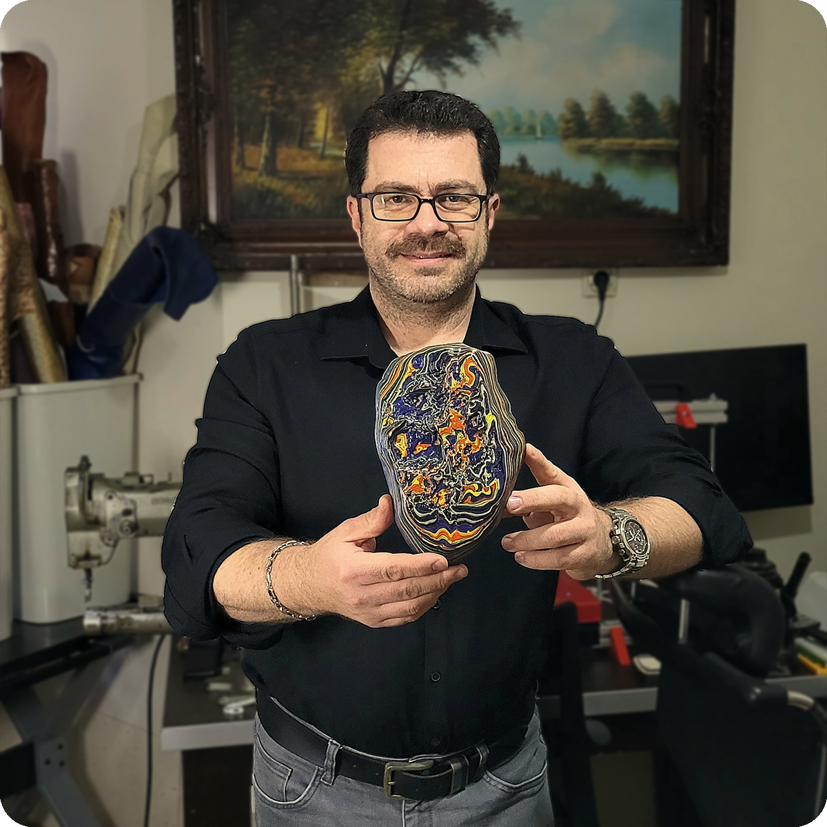 Stone Canvases emerge from loss and transformation. MSK re-materializes a lost sea stone by recycling 3D-printing waste into filament, turning absence into form. Painted and framed as integral works, these stone canvases transform engineering waste into art, allowing the lost stone to persist through material translation.