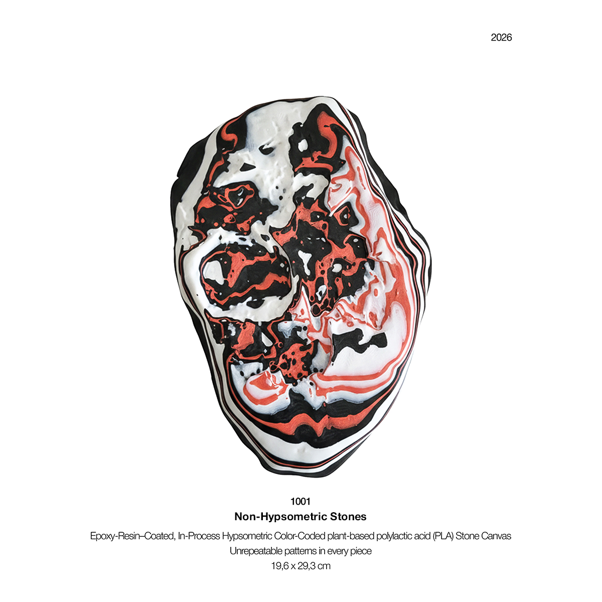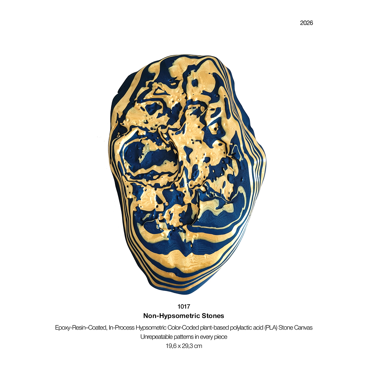These works emerge from Stone Canvases through the deliberate disruption of elevation-based coloration prior to production. Each work is produced through an irreversible color process and epoxy-coated by MSK to achieve its final luminous finish. Every Non-Hypsometric Stone is unique and unrepeatable by design.
