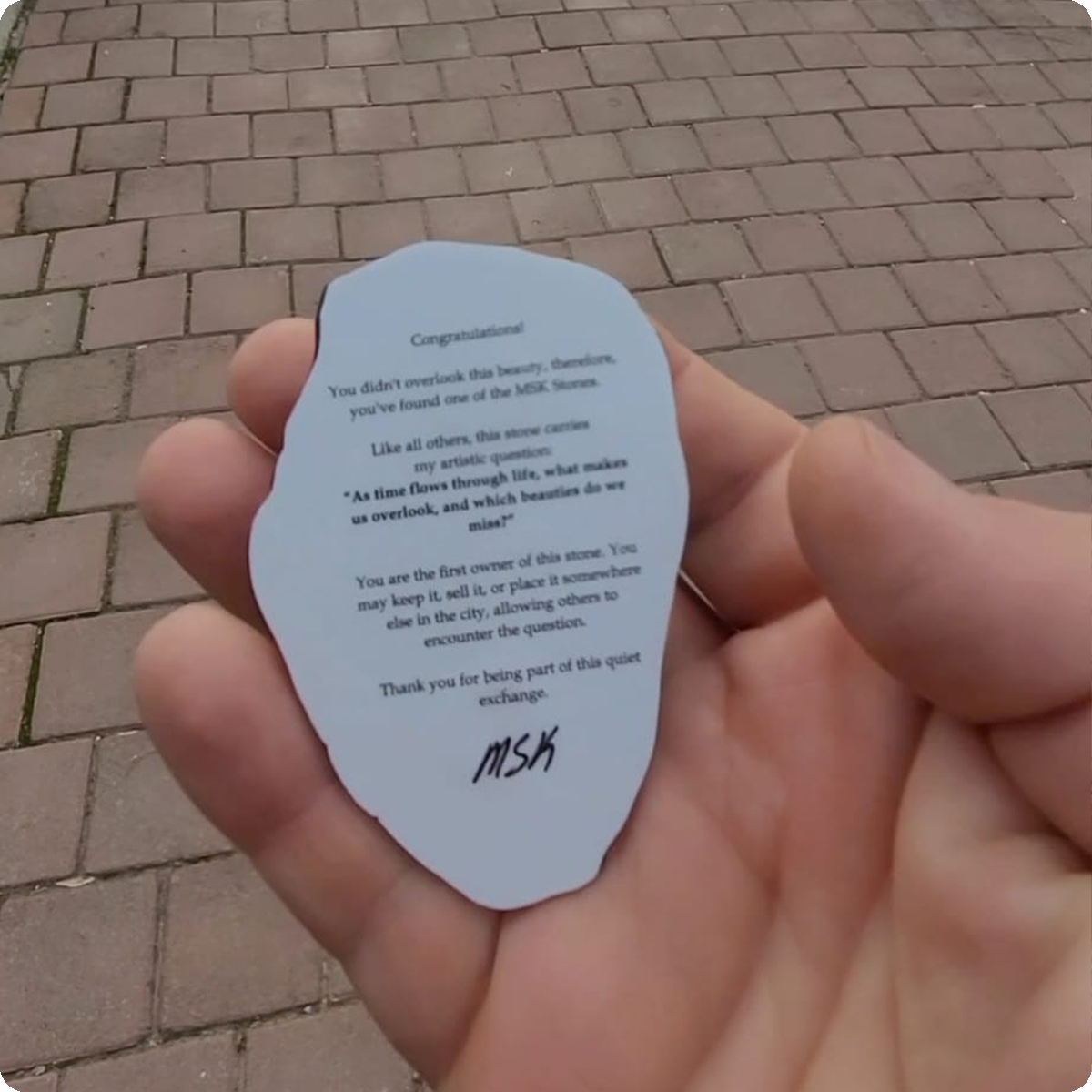 Placed within urban and everyday spaces, MSK stones are created with recycled 3D printing waste. Including NFC Tags, they create quiet encounters and an extending experience where overlooked beauty emerges. Location clues for the stones are on Instagram: @mehmetsalihkanber as an extension of the work.
