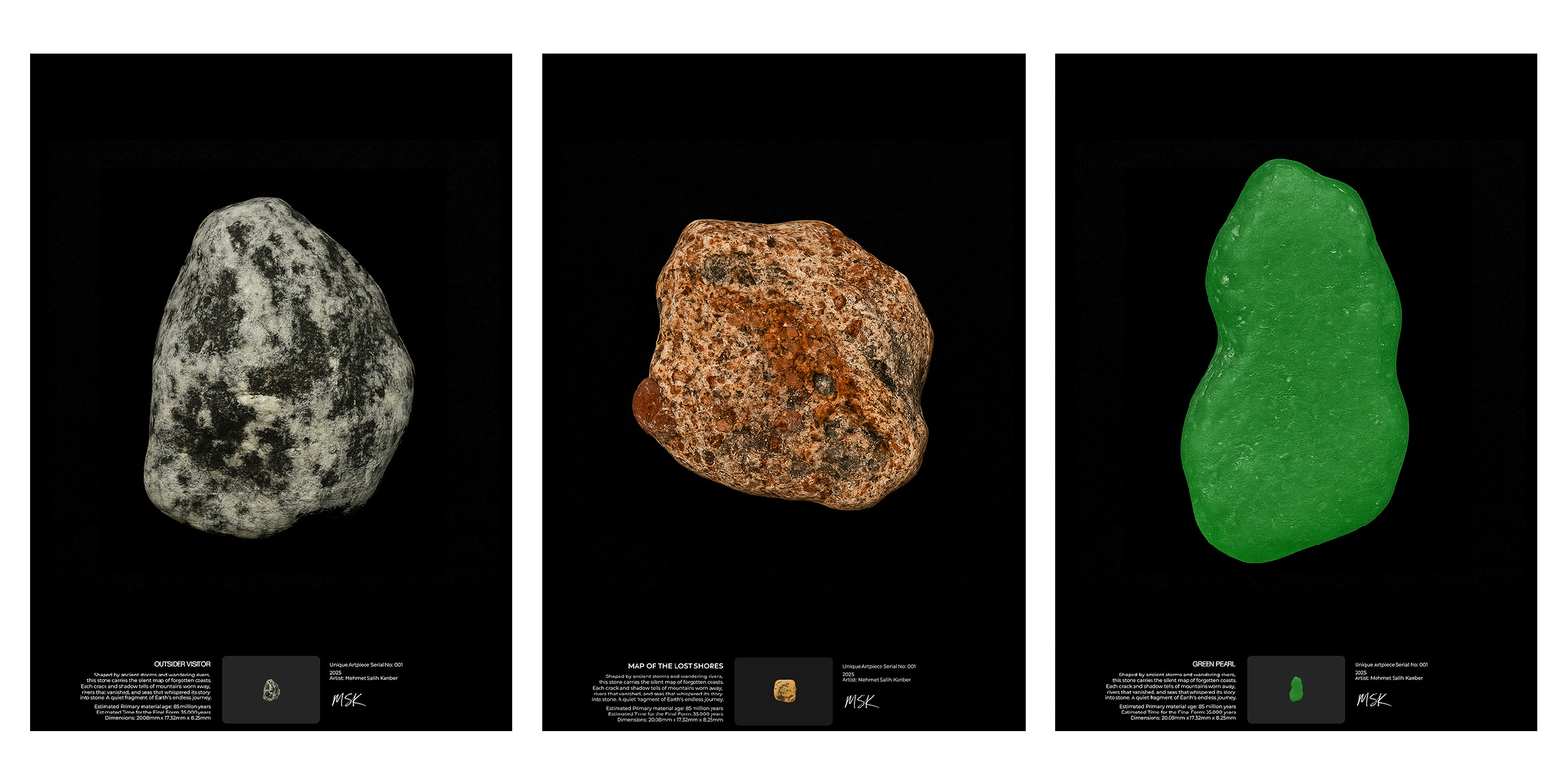 Mediterranean sea stones, macro-photographed by MSK using self-developed techniques, reveal unseen details. The collector’s choice defines the work’s final presence through museum-grade archival printing. Each piece includes the original epoxy-protected stone with its story and signature, unique, irreversible, and shaped by time and choice.